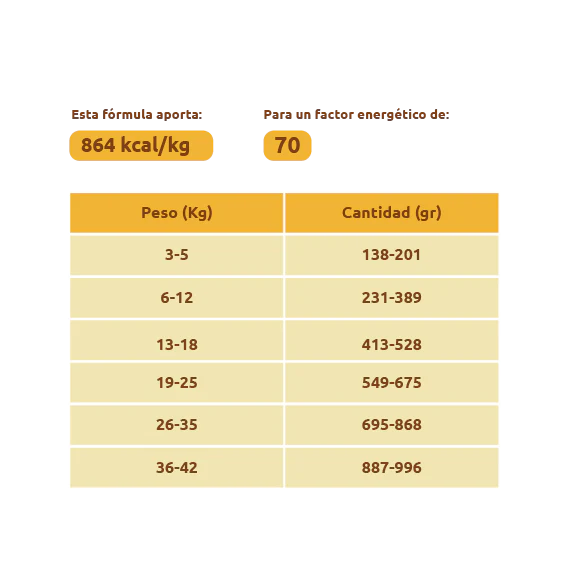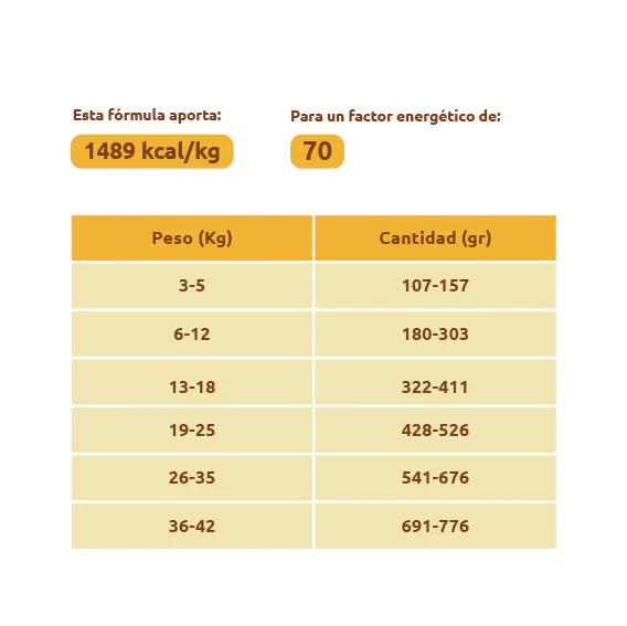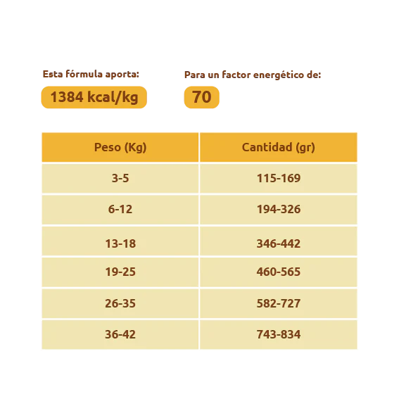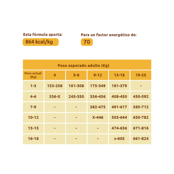 La siguiente tabla suministra un punto de partida que se puede ajustar según sea necesario para mantener una óptima condición corporal y una curva de crecimiento adecuada. Se sugiere controlar el peso de tu mascota y ajustar las raciones según sea necesario. Recomendamos alimentar mínimo dos veces al día y mantener siempre agua fresca y limpia disponible. (la frecuencia puede variar según cada paciente). Esta fórmula es apta para caninos que en su adultez lleguen a pesar máximo 25 kg. No es apta para perros gigantes (gran danés, terranova, san bernardo, etc). Perros con altos requerimiento energético como Collies y Cocker pueden necesitar ajustes en las porciones.